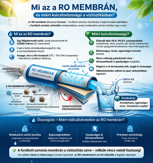 A RO membrán egy valódi áttörést jelent az otthoni ivóvízminőség javításában. Megbízható, hatékony, és olyan szintű tisztaságot nyújt, ami már az első kortynál érezhető. Ha Ön is fontosnak tartja az egészségét, érdemes ezt a technológiát választani.